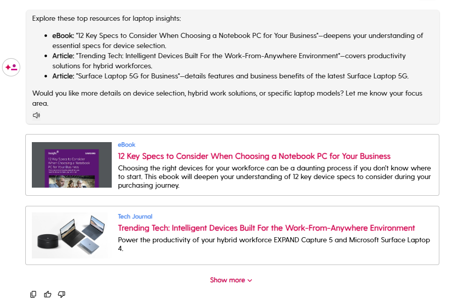 We designed content suggestion cards that allow Nia to surface relevant resources from Insight's content hub based on the user's question. These can include eBooks, articles, reports, case studies, and other content that help users explore topics and learn more about available solutions.