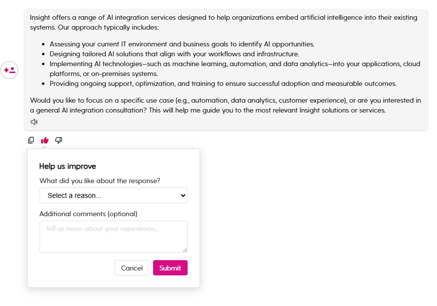 We introduced a feedback option that allows users to rate Nia's responses using thumbs up or thumbs down. When feedback is provided, users can select a reason and optionally leave additional comments to share more details about their experience.