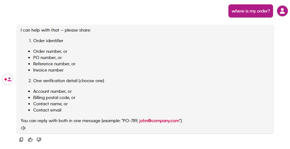 We explored support for order-related inquiries within Nia, allowing users to check order information directly through the assistant. For logged-out users, Nia requests an order identifier and a verification detail before providing updates. This capability is still evolving as part of the beta phase.