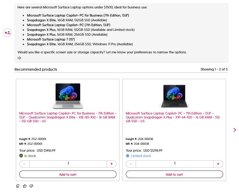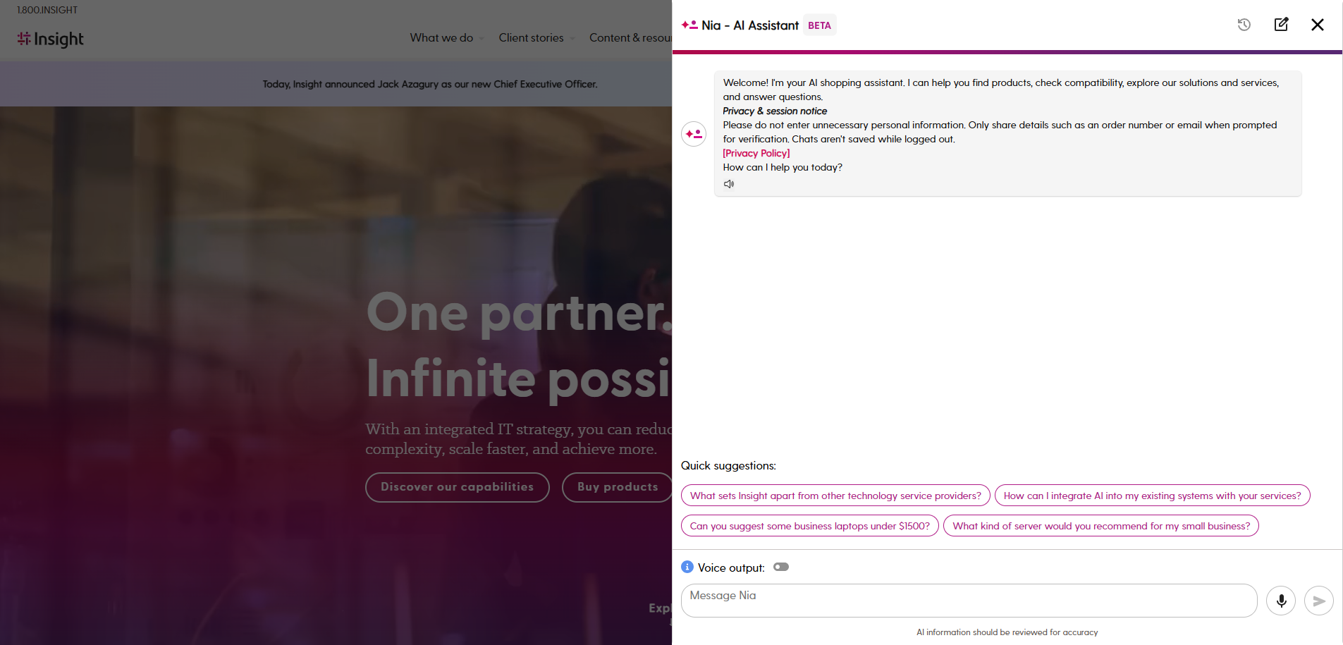 Nia is Insight’s next-generation AI assistant designed to help users navigate product discovery, procurement, and support tasks through a conversational interface. It enables users to ask product questions, add items to cart, track orders, and access relevant content without leaving the page.